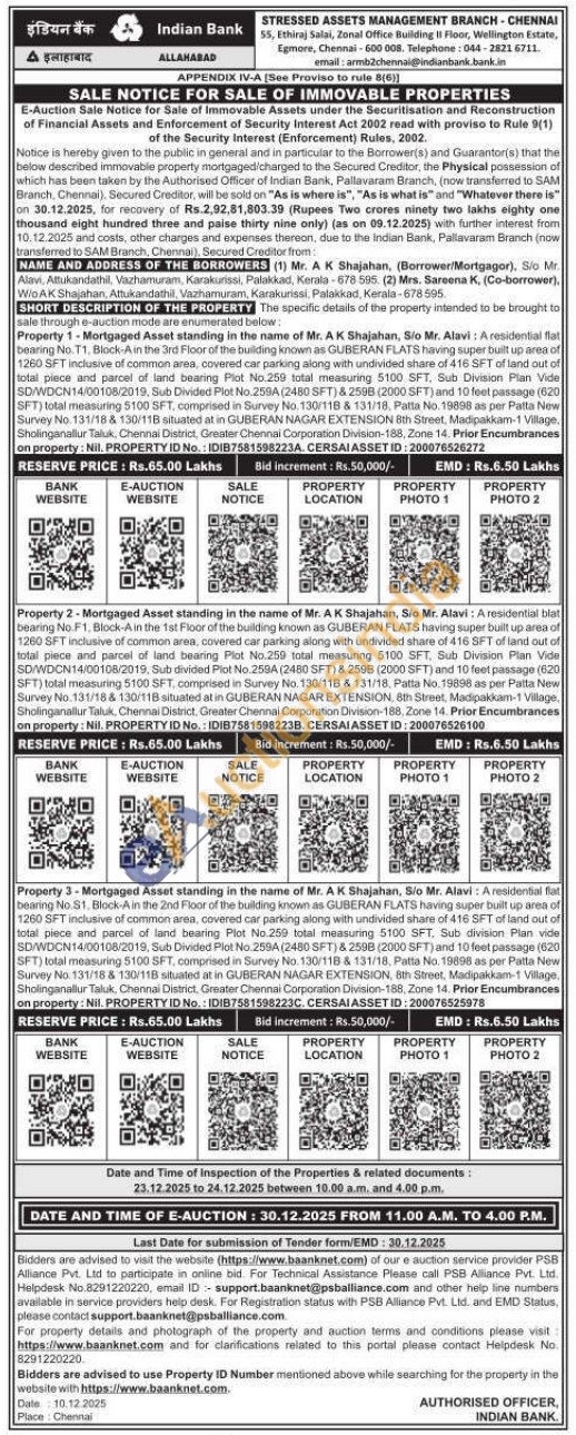 Property 2-Mortgaged Asset standing in the name of Mr. AK Shajahan, Sio Mr. Alavi: A residential blat bearing No.F1, Block-A in the 1st Floor of the building known as GUBERAN FLATS having super built up area of 1260 SFT inclusive of common area, covered car parking along with undivided share of 416 SFT of land out of total piece and parcel of land bearing Plot No.259 total measuring 5100 SFT, Sub Division Plan Vide SD/WDCN14/00108/2019, Sub divided Plot No.259A (2480 SFT) & 2598 (2000 SFT) and 10 feet passage (620) SFT) total measuring 5100 SFT, comprised in Survey No. 130/118 & 131/18, Patta No. 19898 as per Patta New Survey No.131/18 & 130/118 situated at in GUBERAN NAGAR EXTENSION, 8th Street, Madipakkam-1 Village, Sholinganallur Taluk, Chennai District, Greater Chennai Corporation Division-188, Zone 14. Prior Encumbrances on property: Nil. PROPERTY ID No.: IDIB7581598223B. CERSAIASSET ID: 200076526100