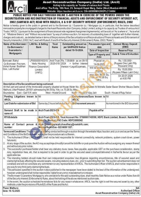 All that part and parcel of the Immovable property situated at House Water No. 16/19, Situated At Mohalla Sadar Bazar Shohar Mauza Dadra Mathura, Uttar Pradesh, 281001 admeasuring 84.05 Sq. Yds.i.e. 70.28 Sq. Mtrs.