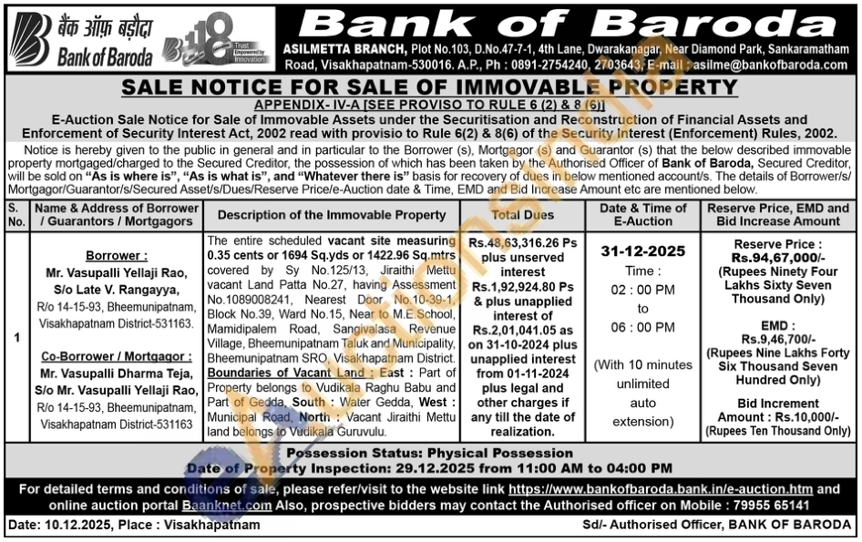 The entire scheduled vacant site measuring 0.35 cents or 1694 Sq.yds or 1422.96 Sq.mtrs covered by Sy No.125/13, Jiraithi Mettu vacant Land Patta No.27, having Assessment No. 1089008241, Nearest Door No.10-39-1, Block No.39, Ward No.15, Near to M.E.School, Mamidipalem Road, Sangivalasa Revenue Village, Bheemunipatnam Taluk and Municipality, Bheemunipatnam SRO, Visakhapatnam District. Boundaries of Vacant Land: East: Part of Property belongs to Vudikala Raghu Babu and Part of Gedda, South Water Gedda, West: Municipal Road, North: Vacant Jiraithi Mettu land belongs to Vudikala Guruvulu