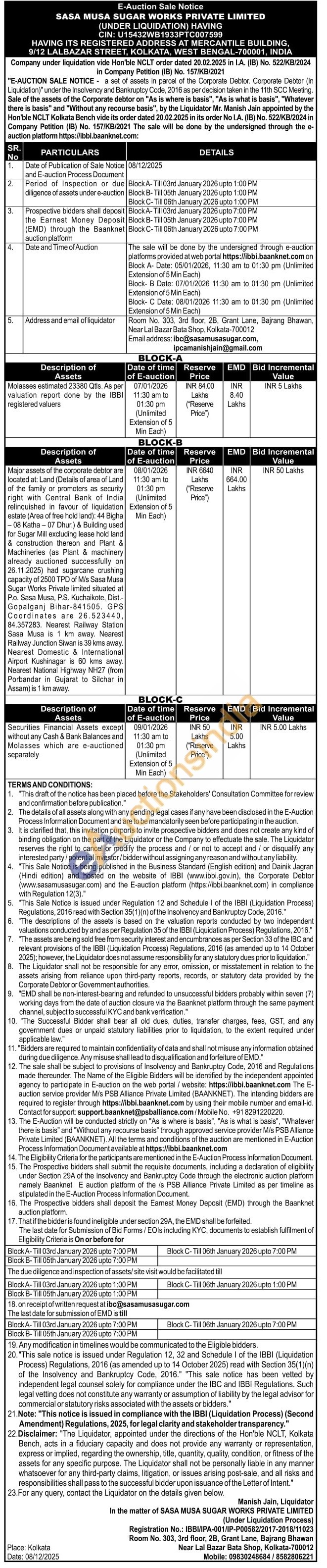 Securities Financial Assets except without any Cash & Bank Balances and Molasses which are e-auctioned separately