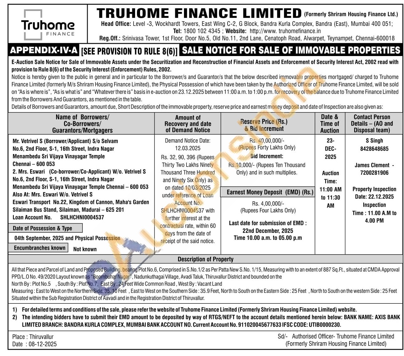 All that Piece and Parcel of Land and Proposed Building, bearing Plot No.6, Comprised in S.No. 1/2 as Per Patta New S.No. 1/15, Measuring with to an extent of 887 Sq.Ft., situated at CMDA Approval PPD/L.0 No. 49/2020 Layout known as "Boombuhar Nagar", Nadunkuthagai Village, Avadi Taluk, Thiruvallur District and bounded on the North By: Plot No.5, South By: Plot No.7, East By: 24 Feet Wide Common Road, West By: Vacant Land Measuring: East to West on the Northern Side: 35. 10 Feet, East to West on the Southern Side: 35.9 Feet, North to South on the Eastern Side: 25 Feet, North to South on the western Side: 25 Feet Situated within the Sub Registration District of Aavadi and in the Registration District of Thiruvallur.