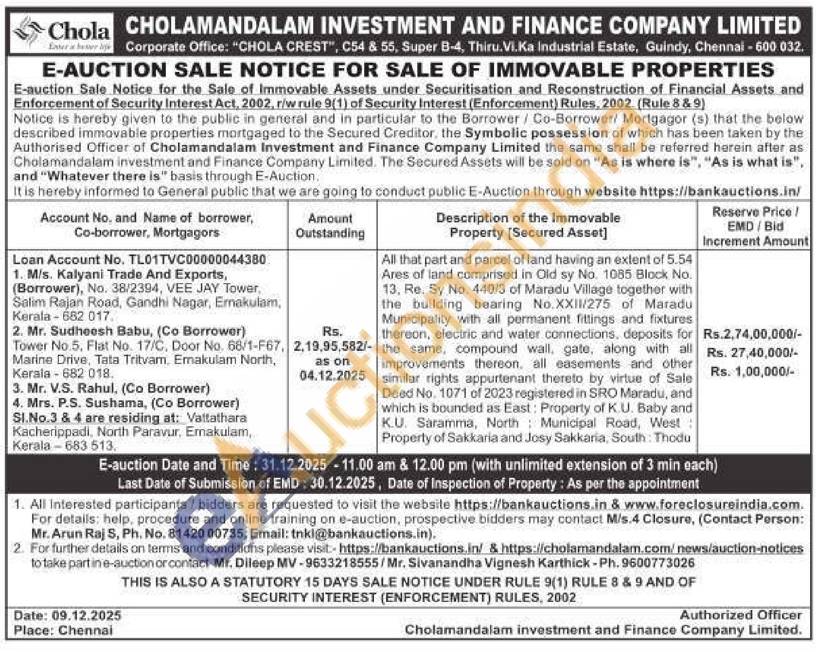 All that part and parcel of land having an extent of 5.54 Ares of land comprised in Old sy No. 1085 Block No. 13, Re. Sy No. 440/3 of Maradu Village together with the building bearing No.XXII/275 of Maradu Municipality with all permanent fittings and fixtures thereon, electric and water connections, deposits for the same, compound wall, gate, along with all improvements thereon, all easements and other similar rights appurtenant thereto by virtue of Sale Deed No. 1071 of 2023 registered in SRO Maradu, and which is bounded as East: Property of K.U. Baby and K.U. Saramma, North Municipal Road, West: Property of Sakkaria and Josy Sakkaria, South: Thodu