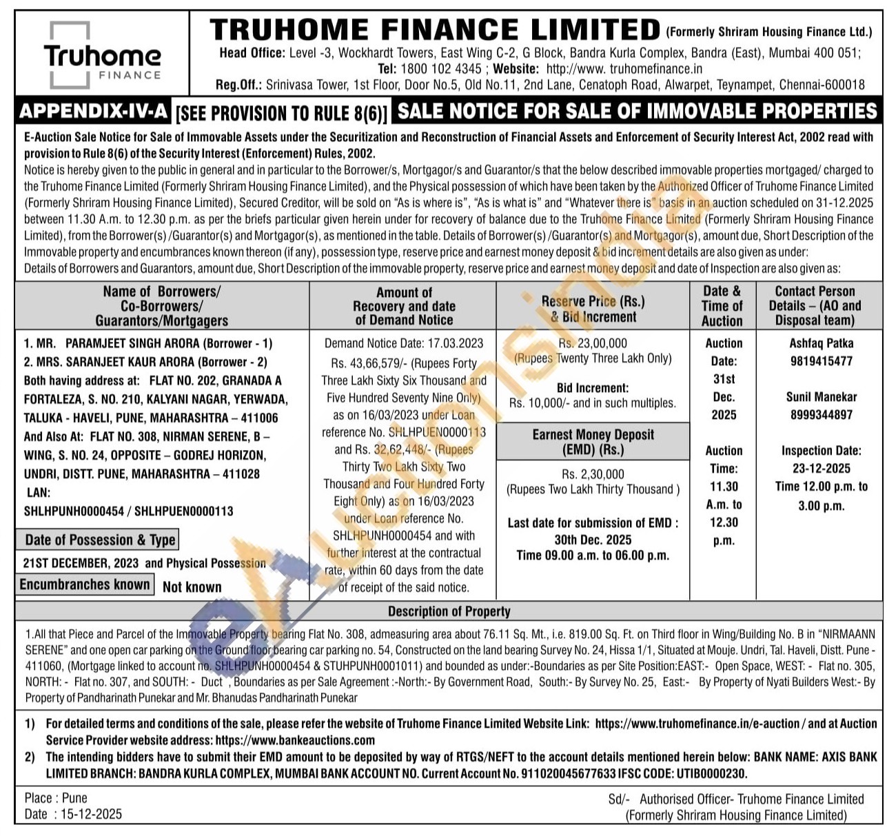 1.All that Piece and Parcel of the Immovable Property bearing Flat No. 308, admeasuring area about 76.11 Sq. Mt., i.e. 819.00 Sq. Ft. on Third floor in Wing/Building No. B in "NIRMAANN SERENE" and one open car parking on the Ground floor bearing car parking no. 54, Constructed on the land bearing Survey No. 24, Hissa 1/1, Situated at Mouje. Undri, Tal. Haveli, Distt. Pune -411060, (Mortgage linked to account no. SHLHPUNH0000454 & STUHPUNH0001011) and bounded as under:-Boundaries as per Site Position: EAST: Open Space, WEST: Flat no. 305, NORTH: Flat no. 307, and SOUTH: Duct, Boundaries as per Sale Agreement:-North:- By Government Road, South:- By Survey No. 25, East: By Property of Nyati Builders West:- By Property of Pandharinath Punekar and Mr. Bhanudas Pandharinath Punekar