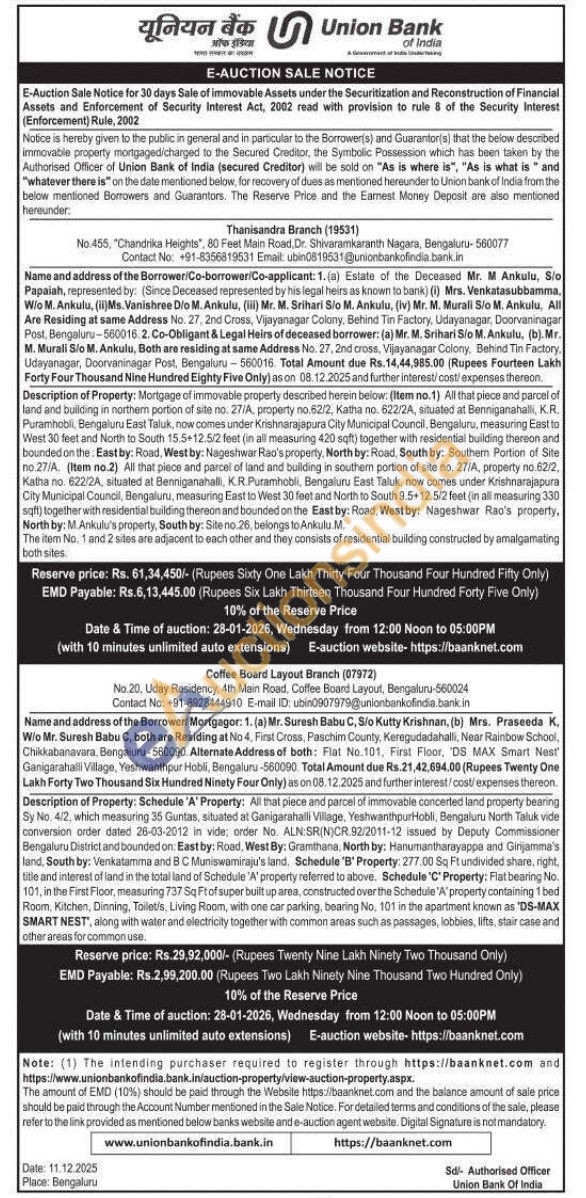 Description of Property: Mortgage of immovable properly described herein below: (Item no.1) All that piece and parcel of land and building in northem portion of site no. 27/A, property no.62/2, Katha no. 622/2A, situated at Benniganahalli, K.R. Puramhobli, Bengaluru East Taluk, now comes under Krishnarajapura City Municipal Council, Bengaluru, measuring East to West 30 feet and North to South 15.5+12.5/2 feet (in all measuring 420 sqft) together with residential building thereon and bounded on the East by: Road, West by: Nageshwar Rao's property, North by: Road, South by: Southern Portion of Site no.27/A. (Item no.2) All that piece and parcel of land and building in southern portion of site no. 27/A, property no.62/2, Katha no. 622/2A, situated at Benniganahalli, K.R.Puramhobli, Bengaluru East Taluk, now comes under Krishnarajapura City Municipal Council, Bengaluru, measuring East to West 30 feet and North to South 9.5+12.5/2 feet (in all measuring 330 sqft) together with residential building thereon