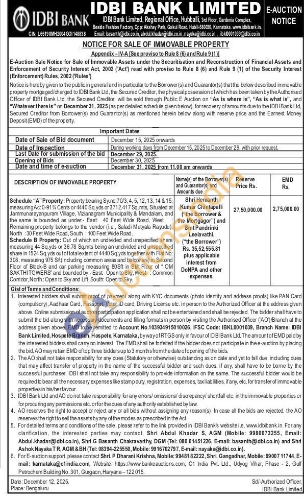 Schedule "A" Property: Property bearing Sy.no:70/3, 4, 5, 12, 13, 14 & 15, measuring Ac: 0-91% Cents or 4440 Sq. yds or 3712.417 Sq.mts, Situated at Jammunarayanpuram Village, Vizianagram Municipality & Mandalam, and the same is bounded as under: East: 40 Feet Wide Road, West Remaining property belongs to the vendor (i.e., Saladi Mutyala Rayudu), North: 30 Feet Wide Road, South 100 Feet Wide Road Schedule B Property: Out of which an undivided and unspecified share. measuring 44 Sq.yds or 36.78 Sq.mts being an undivided and unspecified share in 1524 Sq.yds out of totalextent of 4440 Sq.yds together with Flat No: 308, measuring 975 Sft(Induding common areas and balconies) in Second Floor of Block-B and car parking measuring 80Sft in Stilt Floor of "OM SAKTHI TOWERS' and bounded by:-East Open to Sky, West: Common Comidor, North: Open to Sky and Lift, South: Open to Sky.