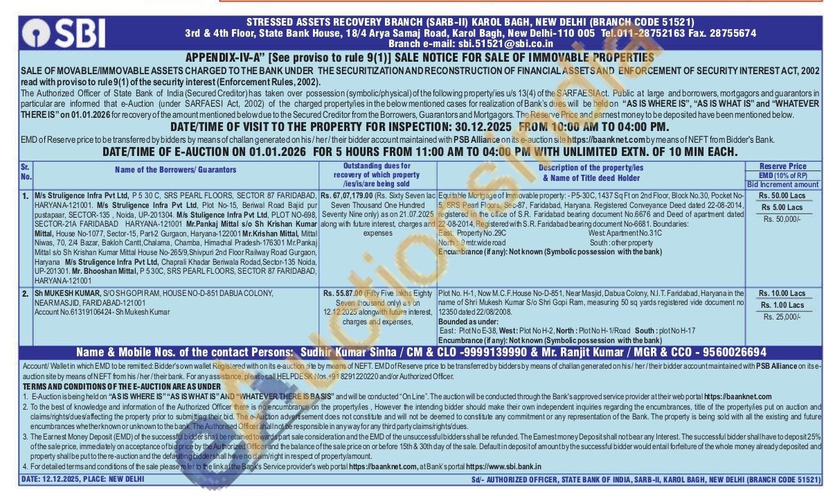 Equitable Mortgage of Immovable property: -P5-30C, 1437 Sq Ft on 2nd Floor, Block No.30, Pocket No-5, SRS Pearl Floors. Sec-87. Faridabad, Haryana. Registered Conveyance Deed dated 22-08-2014 registered in the office of S.R. Faridabad bearing document No.6676 and Deed of apartment daled 22-08-2014, Registered with S. R. Faridabad bearing document No-6681. Boundaries East: Property No.290 North: 9mtr.wide road West Apartment No.310 South: other property