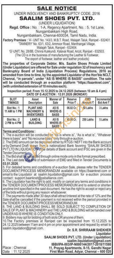 Liquidation E-Auction Plant & Machinery Auction in chennai, Chennai