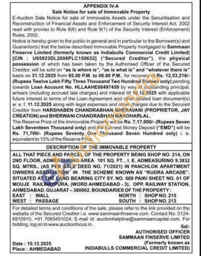 ALL THAT PIECE AND PARCEL OF THE PROPERTY BEING SHOP NO. 214. ON 2ND FLOOR, ADMEASURING AREA 101 SQ. FT., I. E. ADMEASURING 9.3832 SQ. MTRS., (AS PER SALE DEED NO. 71/2021) IN PANCHLOK APARTMENT OWNERS ASSOCIATION IN THE SCHEME KNOWN AS "RUDRA ARCADE", SITUATED AT THE LAND BEARING CITY SY. NO. 669 PAIKI SHEET NO. 01 OF MOUJE RAILWAYPURA, (WORD AHMEDABAD-3), OPP. RAILWAY STATION, AHMEDABAD, GUJARAT-380002. BOUNDARIES OF THE PROPERTY: EAST: WALL WEST PASSAGE NORTH SHOP NO. 215 SOUTH SHOP NO.213