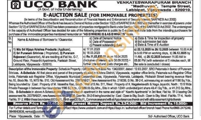 Description of the Immovable Property: Schedule Property: Gift Settlement deed No. 1342/2007, dated: 12.03.2007, SRO Patamata in favour of Puranam Srinivas. A-Schedule: All that piece and parcel of the property situated in Krishna District, Vijayawada, registrar office limits, Palamata sub Registrar Office limits, Patamata sub Registrar Office, Vijayawada Municipal Corporation area, Vijayawada, Patamata, Labbipeta, Pitchaiah Street bearing revenue Ward No.10, Block No. 15, NTS No. 510, Old Assessment No. 25078AB/21, New Assessment No. 216036, D.No. 39-2-6, admeasuring an extent off 1188 Sq. Yds.. Being bounded by: East: Property of M. Vasantha Rao, South Wall of S.No. 511, West: Property of K. Nagaleelavathi & Naga Jayanthi, North: 15 ft Wide Private Passage in between four boundaries 1186 Sq. Yds., Or 999.55 Sq.Mtrs., Site in which 1/24th undivided joint share 49.41 Sq. Yds., or 41.313 Sq.Mtrs.. Site. B-Schedule:in above A-Schedule proeprty constructed an apartment in the name and style of Keerthi Apartments" in 3rd floor, Flat No. TF-3 bearing Old assessment No. 25378AB/21, new Assessment No. 216038, Door No. 39-2-6 being bounded by: East: Open to Sky, South: Open to Sky, West: Flat No. TF-4, North Pat No. TF-2. Within these boundaries 800 Sq Ft, Plinth area 20 Sq Ft, Common area and with all Appurtenanoss therein and with all its easement rights therein