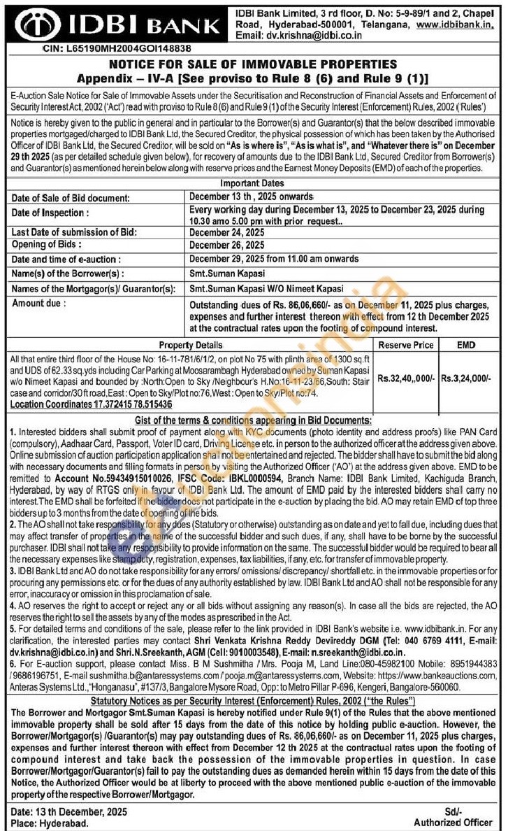 All that entire third floor of the House No: 16-11-781/6/1/2, on plot No 75 with plinth area of 1300 sq.ft and UDS of 62.33 sq.yds including Car Parking at Moosarambagh Hyderabad owned by Suman Kapasi w/o Nimeet Kapasi and bounded by : North: Open to Sky/Neighbour's H.No: 16-11-23/66, South: Stair case and corridor/30 ft road, East: Open to Sky/Plot no:76.West: Open