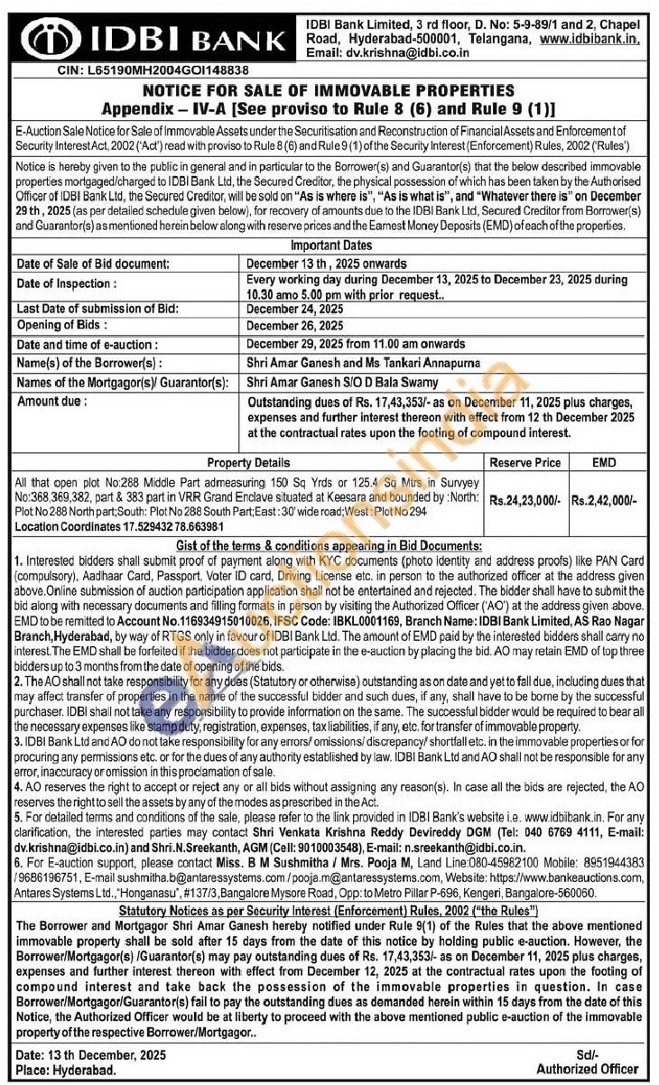 All that open plot No.288 Middle Part admeasuring 150 Sq Yrds or 125.4 Sq Mtrs in Survyey No:368,369,382, part & 383 part in VRIR Grand Enclave situated at Keesara and bounded by North: Plot No 288 North part; South: Plot No 288 South Part: East: 30' wide road: West: Plot No 294 Location Coordinates 17.52943278.663981