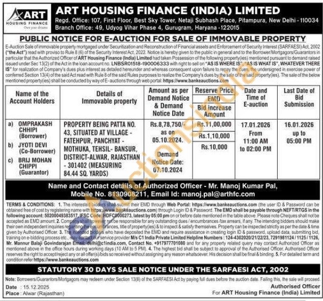 PROPERTY BEING PATTA NO. 43, SITUATED AT VILLAGE -FATEHPUR, PANCHYAT-MOTHUKA, TEHSIL-BANSUR. DISTRICT-ALWAR, RAJASTHAN 301402 (MEASURING 84.44 SQ. YARDS)