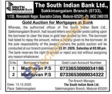 South Indian Bank Gold Auctions Auction in Madurai