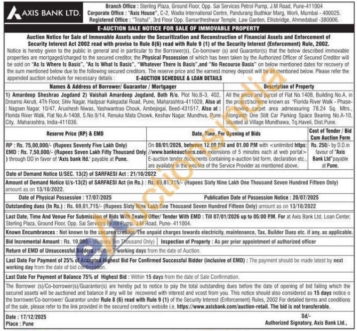 All the piece and parcel of Flat No.1408, Building No.A, in the project/scheme known as "Florida River Walk - Phase-I", having carpet area admeasuring 78.24 Sq. Mtrs Alongwith One Stilt Car Parking Space Bearing No.A-10, situated at Village Mundhawa, Tq. Haveli, Dist Pune