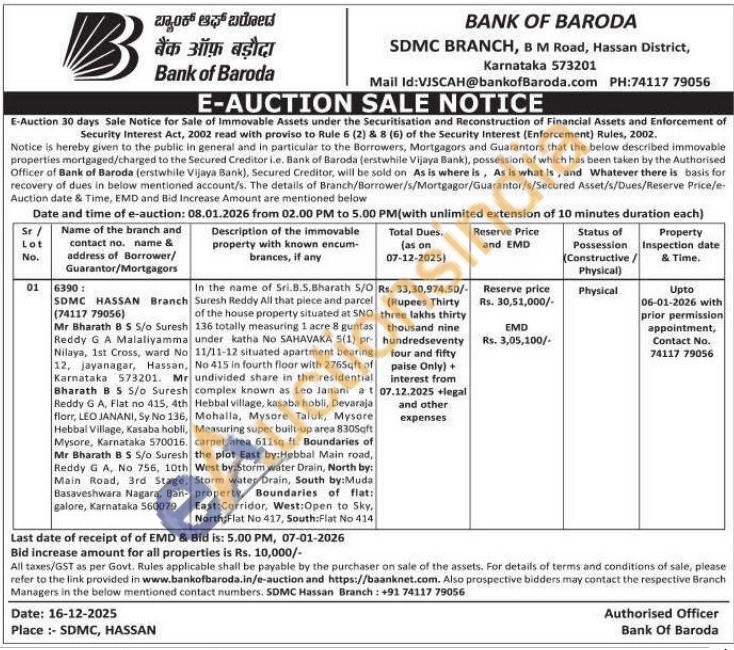 In the name of Sri.B.5. Bharath 5/0 Suresh Reddy All that piece and parcel of the house property situated at SNO 136 totally measuring 1 acre 8 guntas under katha No SAHAVAKA 5(1) pr 11/11-12 situated apartment bearing No 415 in fourth floor with 2765qft of undivided share in the residential complex known as Leo Janani at Hebbal village, kasaba hobli, Devaraja Mohalla, Mysore Taluk, Mysore Measuring super built-up area 830Soft carpet area 611sq ft. Boundaries of the plot East by:Hebbal Main road, West by:Storm water Drain, North by: Storm water Drain, South by:Muda property, Boundaries of flat: East:Corridor, West: Open to Sky, North: Flat No 417, South: Flat No 414