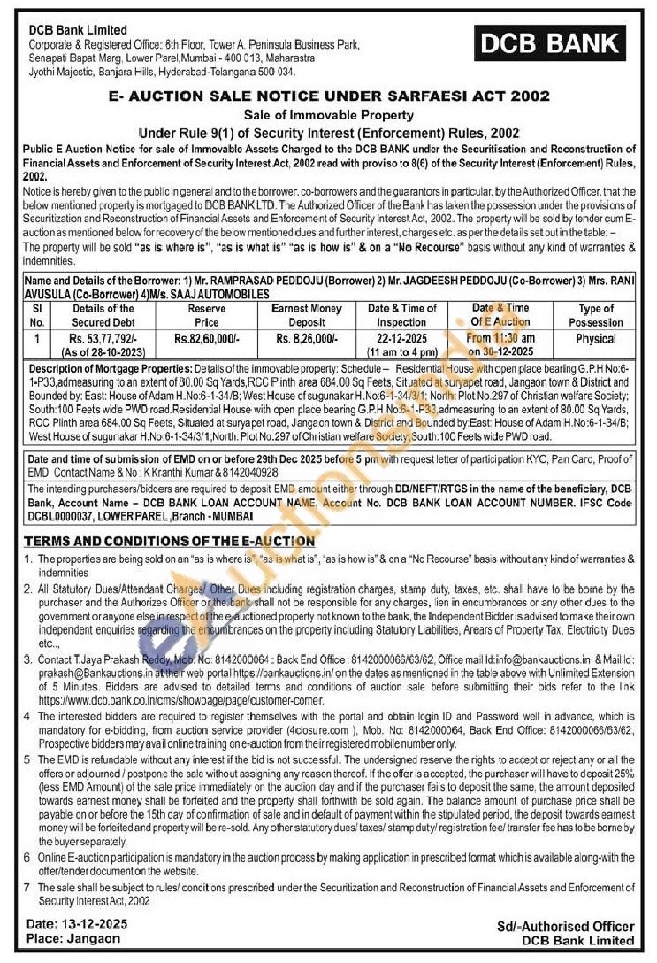 Description of Mortgage Properties: Details of the immovable property: Schedule- Residential House with open place bearing G.P.H No:6- 1-P33, admeasuring to an extent of 80.00 Sq Yards, RCC Plinth area 684.00 Sq Feets, Situated at suryapet road, Jangaon town & District and Bounded by: East: House of Adam H.No:6-1-34/B; West House of sugunalkar H.No:6-1-34/3/1; North: Plot: No.297 of Christian welfare Society: South:100 Feets wide PWD road. Residential House with open place bearing G.P.H No:6-1-P33,admeasuring to an extent of 80.00 Sq Yards, RCC Plinth area 684,00 Sq Feets, Situated at suryapet road, Jangaon town & District and Bounded by: East: House of Adam H.No:6-1-34/B; West House of sugunakar H.No:6-1-34/3/1: North: Plot No.297 of Christian welfare Society South: 100 Feets wide PWD road