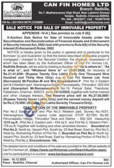 DESCRIPTION OF THE IMMOVABLE PROPERTY : Plot No.2 Eastern part and Plot No.3 Western part, Survey No. 163/1, Veeraraghava Nagar Layout (vide approved DTCP 821/95) No.89. Perumalpattu Village, Thiruvallur Taluk and District 602 024 measuring 1210 sq.ft (Plot No.2. Eastern part-434 sq.ft and Plot No.3, Western Part-776 sq.ft) Together with building and other amenities thereon. Bounded on Plot No.2: North by: Vacant Plat, South by: 23 feet Road, East by: Plot No.3, West by: Remaining Portion of Plot No. 2. Bounded on Plot No.3: North by: Vacant Plot, South by: 23 feet Road, East by: Remaining Portion of Plot No.3. West by: Plot No.2
