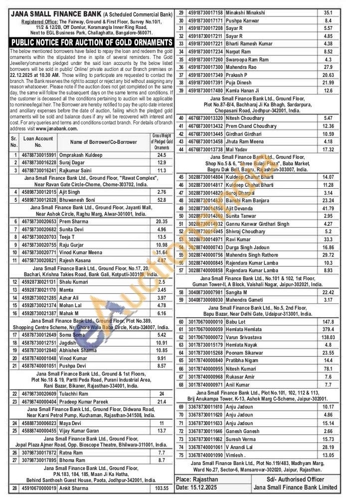 Jana Small Finance Bank Gold Auctions Auction in Bengaluru