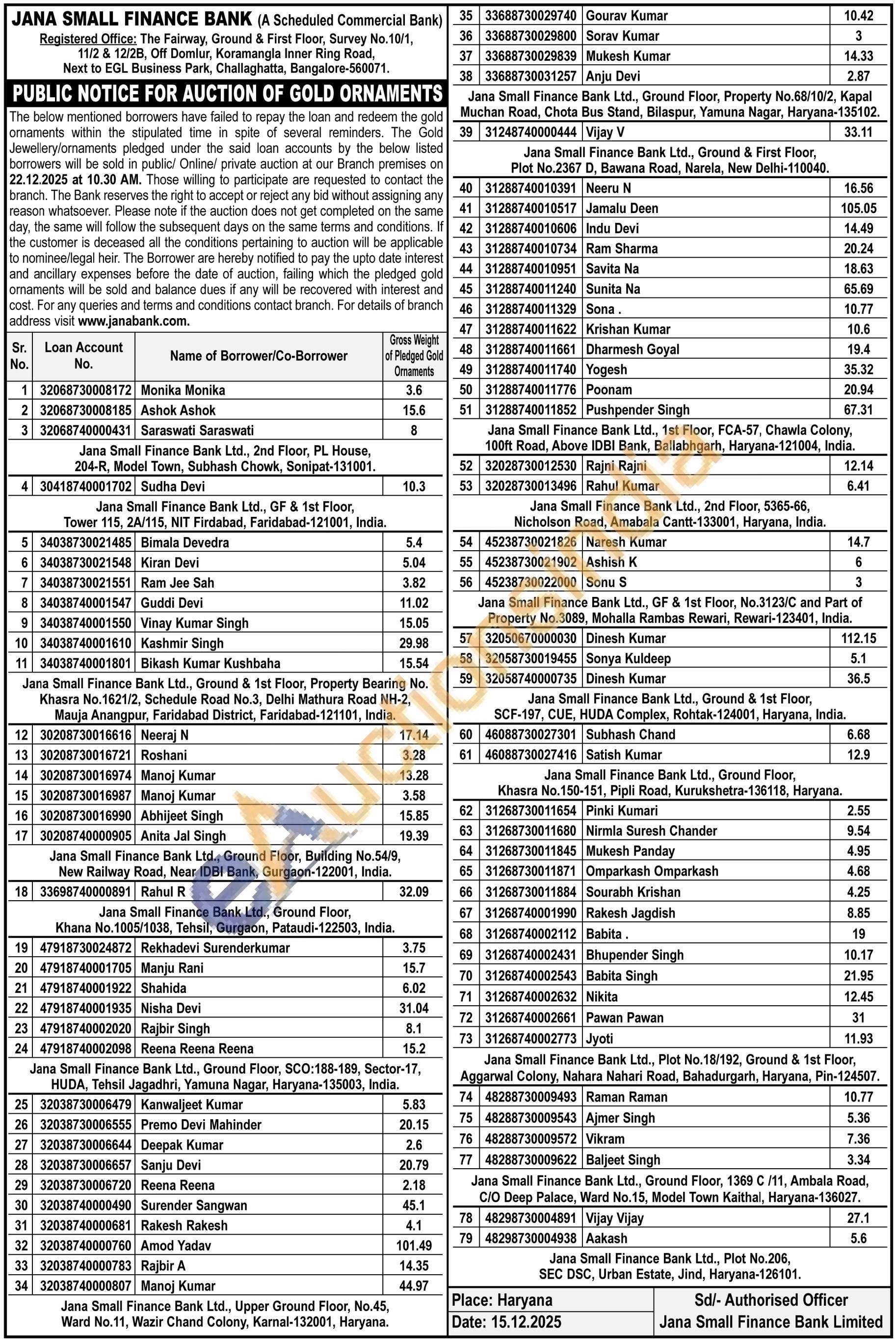 Jana Small Finance Bank Gold Auctions Auction in Bengaluru