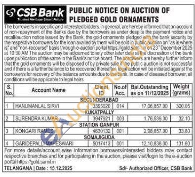 CSB Bank Gold Auctions Auction in Secunderabad