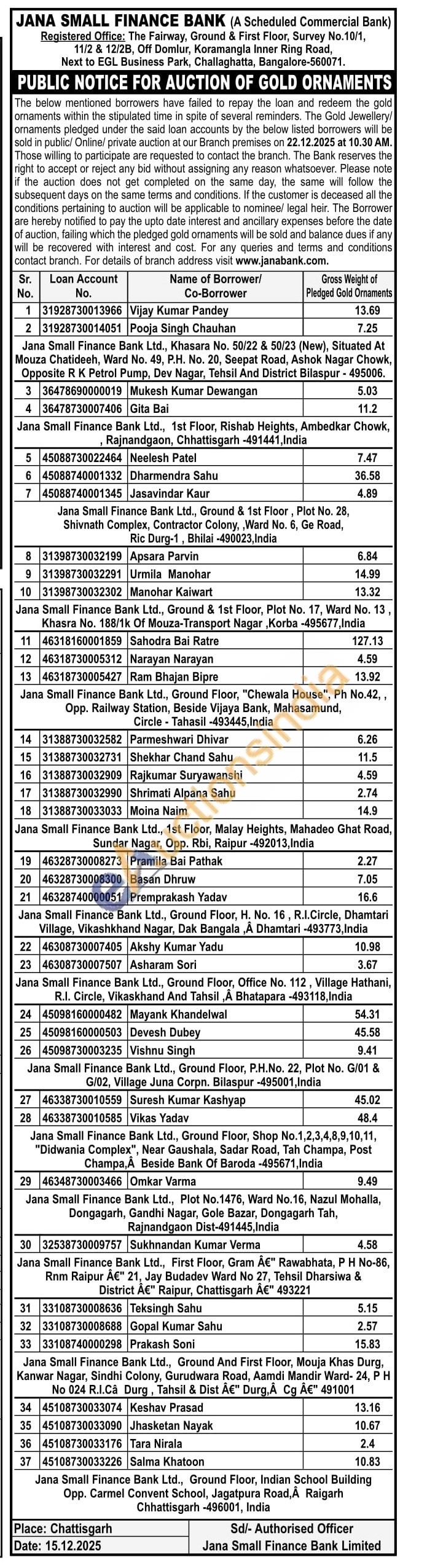 Jana Small Finance Bank Gold Auctions Auction in Bengaluru