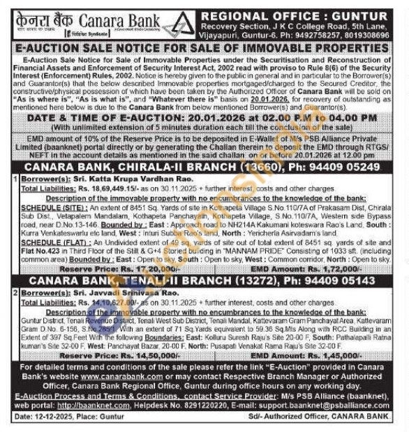 Guntur District, Tenali Revenue District, Tenali West Sub District, Tenali Mandal, Kattevaram Gram Panchayat Area, Kattevaram Gram D. No. 6-156, S.No. 285/1, With an extent of 71 Sq Yards equivalent to 59.36 Sq.Mis Along with RCC Building in an Extent of 397 Sq Feet With the following Boundaries: East: Kolluru Suresh Raju's Site 20-00 F, South: Pathalapalli Ratna kumar's Site 32-00 F, West: Panchayat Bazar, 20-00 F. North: Pusapati Venakat Rama Raju's Site 32-00 F