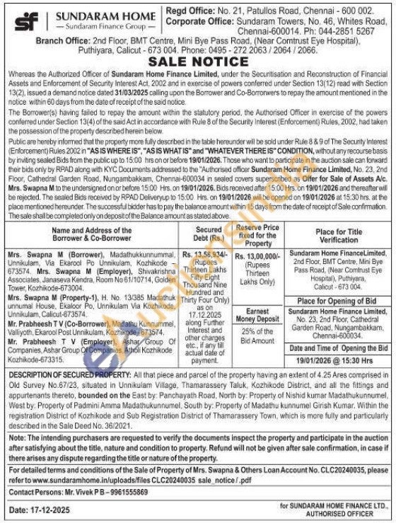 DESCRIPTION OF SECURED PROPERTY: All that piece and parcel of the property having an extent of 4.25 Ares comprised in Old Survey No.67/23, situated in Unnikulam Village, Thamarassery Taluk, Kozhikode District, and all the fittings and appurtenants thereto, bounded on the East by: Panchayath Road, North by: Property of Nishid kumar Madathukunnumel, West by: Property of Padmini Amma Madathukunnumel, South by: Property of Madathu kunnumel Girish Kumar. Within the registration District of Kozhikode and Sub Registration District of Thamarassery Town, which is more fully and particularly described in the Sale Deed No. 36/2021