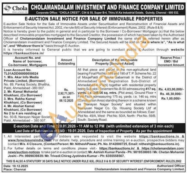 All that piece and parcel in the non-agricultural land bearing Final Plot No. 189 and 190 of T. P. Scheme No. 22 of MoujePaldi of Taluka Sabarmati in the District of Ahmedabad and Registration Sub-District of Ahmedabad-4 (Paldi) together with residential property being Sub plot/Tenement No.B-50 admeasuring 417 sq. yards. i.e. 348.66 sq. mtrs. (Plot area), Ground Floor + First Floor admeasuring 175 sq. yards, ie. 146 sq. mtrs (Construction Area) standing thereon in a scheme known as "Narayan Nagar Society and situated within 'Narayuan Nagar Co. Op. Housing Society Ltd' at Ahmedabad and the same as bounded as follows, East: Plot No. 49/A, West: Plot No. 50/A, North: Plot No. 59/8, South: Society Road
