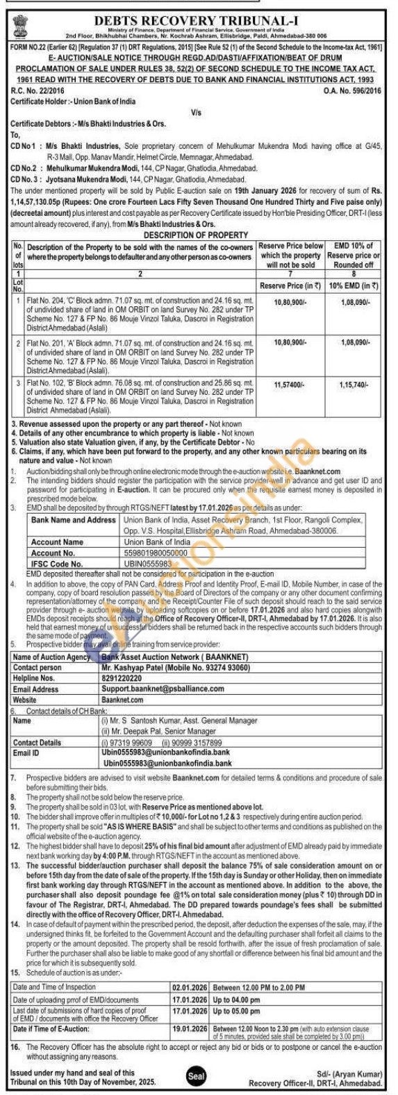 Flat No. 204, "C' Block admn. 71.07 sq. mt. of construction and 24.16 sq. mt. of undivided share of land in OM ORBIT on land Survey No. 282 under TP Scheme No. 127 & FP No. 86 Mouje Vinzol Taluka, Dascroi in Registration District Ahmedabad (Aslali)