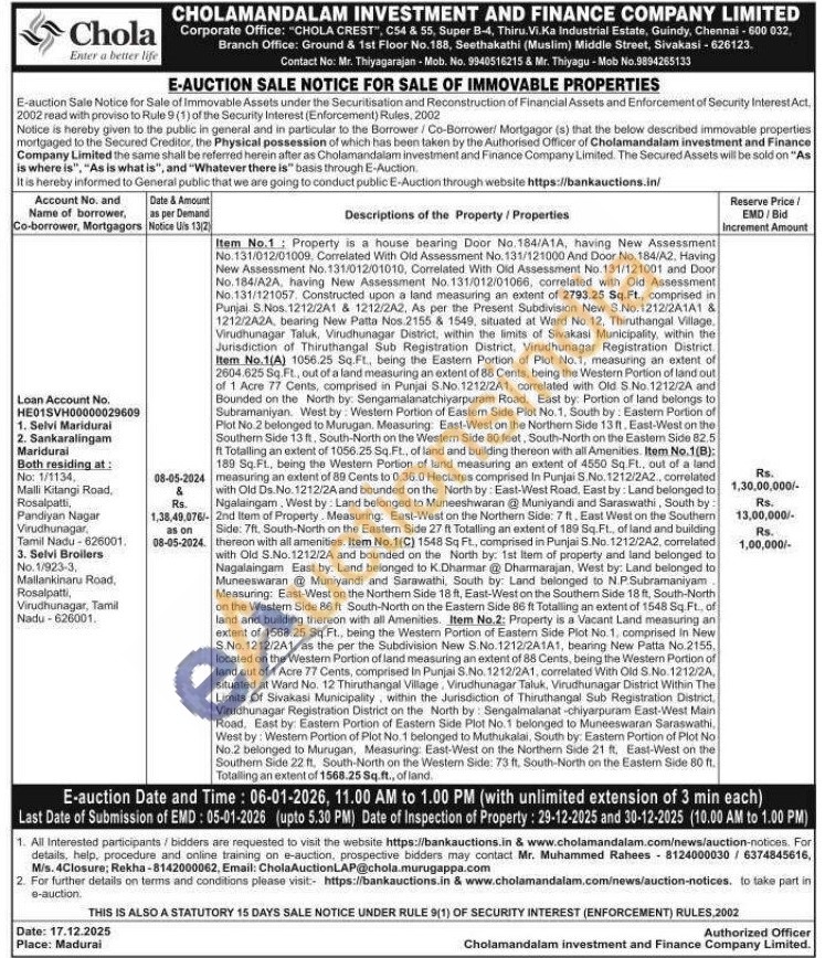 Item No.1: Property is a house bearing Door No. 184/A1A, having New Assessment No. 131/012/01009. Correlated With Old Assessment No. 131/121000 And Door No. 184/A2, Having New Assessment No. 131/012/01010, Correlated With Old Assessment No. 131/121001 and Door No. 184/A2A, having New Assessment No. 131/012/01066, correlated with Old Assessment No. 131/121057. Constructed upon a land measuring an extent of 2793.25 Sq.Ft., comprised in Punjai S. Nos. 1212/2A1 & 1212/2A2, As per the Present Subdivision New S.No.1212/2A1A1 & 1212/2A2A, bearing New Palta Nos 2155 & 1549, situated at Ward No. 12, Thiruthangal Village, Virudhunagar Taluk, Virudhunagar District, within the limits of Sivakasi Municipality, within the Jurisdiction of Thiruthangal Sub Registration District, Virudhunagar Registration District. Item No.1(A) 1056.25 Sq.Ft., being the Eastern Portion of Plot No.1, measuring an extent of 2604.625 Sq.Ft., out of a land measuring an extent of 88 Cents, being the Western Portion of land out of 1 Acre 77 Cents, comprised in Punjai S.No. 1212/2A1, correlated with Old S. No. 1212/2A and Bounded on the North by: Sengamalanatchiyarpuram Road, East by: Portion of land belongs to Subramaniyan. West by Western Portion of Eastern Side Plot No. 1, South by: Eastern Portion of Plot No.2 belonged to Murugan. Measuring: East-West on the Northem Side 13 ft. East-West on the Southern Side 13 ft. South-North on the Western Side 80 feet, South-North on the Eastern Side 82.5 ft Totalling an extent of 1056.25 Sq.Ft., of land and building thereon with all Amenities. Item No.1(B): 180 Sq.Ft., being the Western Portion of land measuring an extent of 4550 Sq.Ft., out of a land measuring an extent of 89 Cents to 0.36.0 Hectares comprised In Punjai S No. 1212/242, correlated with Old Ds. No. 1212/2A and bounded on the North by: East-West Road, East by: Land belonged to Ngalaingam. West by Land belonged to Muneeshwaran Muniyandi and Saraswathi, South by: 2nd Itam of Property Measuring: East-West on the Northern Side: 7 ft. East West on the Southern Side: 7ft, South-North on the Eastern Side 27 ft Totalling an extent of 189 Sq.Ft., of land and building thereon with all amenities. Item No.1(C) 1548 Sq Ft, comprised in Punjai S.No. 1212/2A2, correlated with Old S.No.1212/2A and bounded on the North by: 1st item of property and land belonged to Nagalaingam East by: Land belonged to K.Dharmar @ Dharmarajan, West by: Land belonged to Muneeswaran Muniyandi and Sarawathi, South by: Land belonged to N.P.Subramaniyam. Measuring: East-West on the Northem Side 18 ft, East-West on the Southem Side 18 ft, South-North on the Western Side 86 ft South-North on the Eastern Side 86 ft Totalling an extent of 1548 Sq. Ft, of land and building thereon with all Amenities. Item No.2: Property is a Vacant Land measuring an extent of 1568.25 Sq.Ft., being the Western Portion of Eastern Side Plot No. 1, comprised in New S.No. 1212/2A1, as the per the Subdivision New S.No. 1212/2A1A1, bearing New Patta No.2155, located on the Western Portion of land measuring an extent of 88 Cents, being the Western Portion of land out of 1 Acre 77 Cents, comprised In Punjai S.No. 1212/2A1, correlated With Old S.No. 1212/2A, situated at Ward No. 12 Thiruthangal Village, Virudhunagar Taluk, Virudhunagar District Within The Limits Of Sivakasi Municipality, within the Jurisdiction of Thiruthangal Sub Registration District, Virudhunagar Registration District on the North by Sengalmalanat-chiyarpuram East-West Main Road. East by: Eastem Portion of Eastern Side Plot No.1 belonged to Muneeswaran Saraswathi, West by: Western Portion of Plot No. 1 belonged to Muthukalai, South by Eastern Portion of Plot No No.2 belonged to Murugan, Measuring: East-West on the Northern Side 21 ft. East-West on the Southem Side 22 ft, South-North on the Westem Side: 73 ft, South-North on the Eastern Side 80 ft. Totalling an extent of 1568.25 Sq.ft., of land