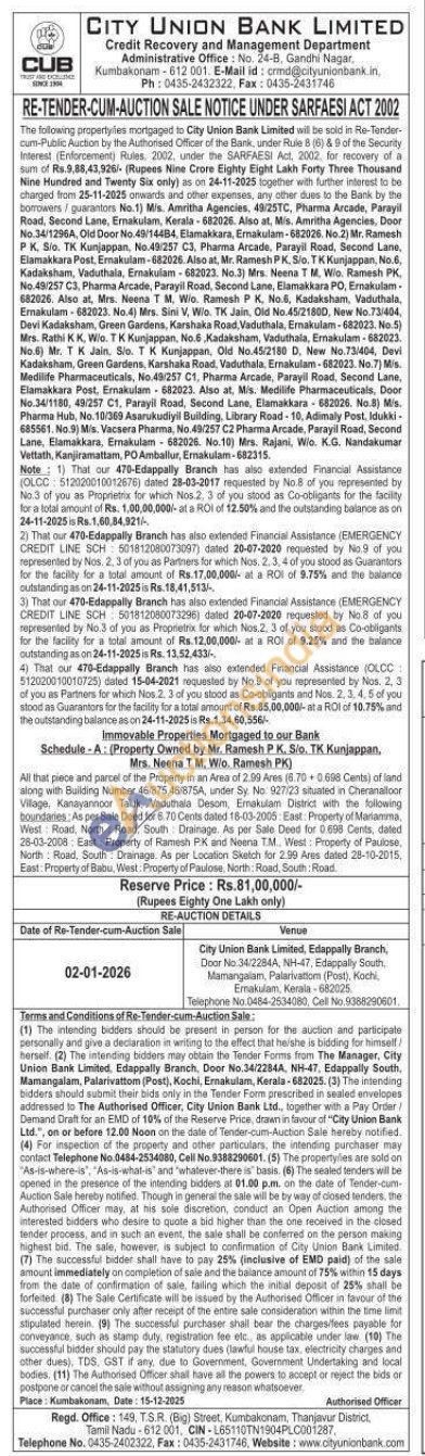 Schedule - A: (Property Owned by Mr. Ramesh P K. S/o. TK Kunjappan, Mrs. Neena T M, W/o. Ramesh PK) : All that piece and parcel of the Property in an Area of 2.99 Ares (6.70 +0.698 Cents) of land along with Building Number 46/875,46/875A, under Sy. No. 927/23 situated in Cheranalloor Village, Kanayannoor Taluk, Vaduthala Desom, Ernakulam District with the following boundaries: As per Sale Deed for 6.70 Cents dated 18-03-2005: East: Property of Mariamma, West Road, North Road, South Drainage. As per Sale Deed for 0.698 Cents, dated 28-03-2008: East: Property of Ramesh P.K and Neena T.M., West: Property of Paulose, North: Road, South: Drainage. As per Location Sketch for 2.99 Ares dated 28-10-2015, East: Property of Babu, West: Property of Paulose, North: Road, South: Road
