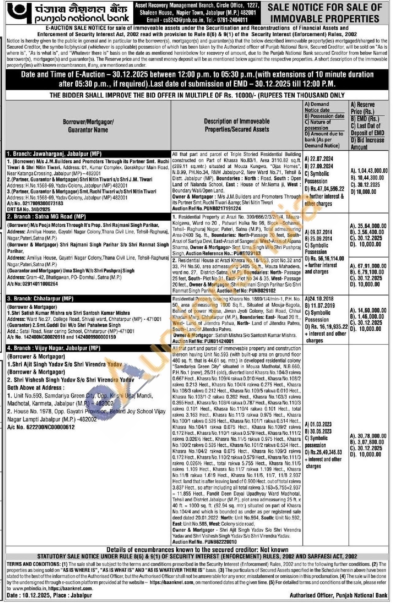 2. Residential House at Arazi Khasra No.18/1/53, plot No.32 and 33, PH No.50, area admeasuring 3405 Sq.ft., Mauza Mahadeva, ward no. 27, District-Satna, (M.P), Boundaries: North-Passage 25 feet, South-Plot No 31, East- Plot No 34 & 35, West-Passage 20 feet., Owner & Mortgagor: Shri Rajmani Singh Parihar S/o Shri Ranmat Singh Parihar, Auction Ref No: PUNB029102