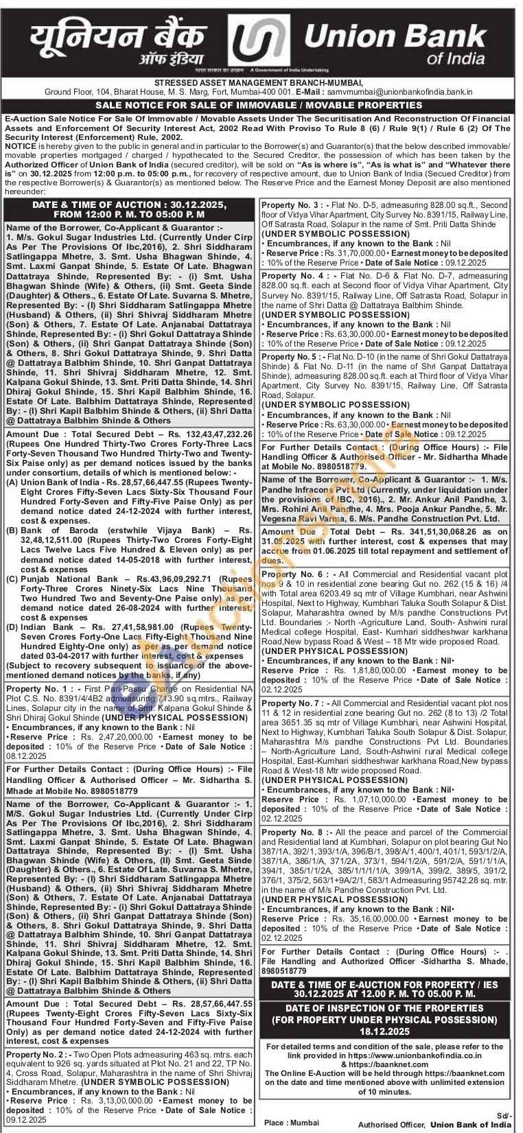 Property No. 7:All Commercial and Residential vacant plot nos 11 & 12 in residential zone bearing Gut no. 262 (8 to 13) /2 Total area 3651.35 sq mtr of Village Kumbhari, near Ashwini Hospital, Next to Highway, Kumbhari Taluka South Solapur & Dist. Solapur, Maharashtra M/s pandhe Constructions Pvt Ltd. Boundaries - North-Agriculture Land, South-Ashwini rural Medical college Hospital, East-Kumhari siddheshwar karkhana Road, New bypass Road & West-18 Mtr wide proposed Road