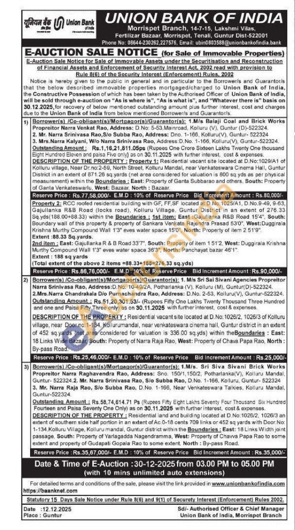 DESCRIPTION OF THE PROPERTY: Resident al vacant site located at D. No: 1026/2, 1026/3 of Kolluru village, near Door.no: 1-134, Kollurumandal, near venkateswara cinema hall, Guntur district in an extent of 452 sq yards (net area considered for valuation is 336.00 sq.yds) within the Boundaries: East: 18 Links Wide Bazaar, South: Property of Narra Raja Rao, West: Property of Chava Papa Rao, North: By-pass Road.