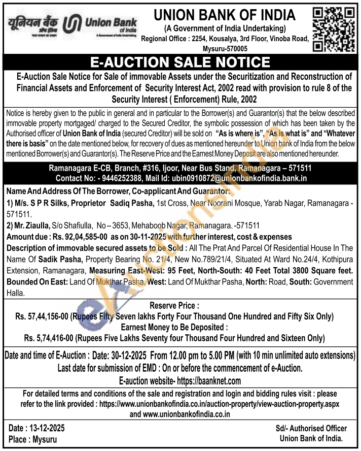 Description of immovable secured assets to be Sold: All The Prat And Parcel Of Residential House In The Name Of Sadik Pasha, Property Bearing No. 21/4, New No.789/21/4, Situated At Ward No.24/4, Kothipura Extension, Ramanagara, Measuring East-West: 95 Feet, North-South: 40 Feet Total 3800 Square feet. Bounded On East: Land Of Mukthar Pasha, West: Land Of Mukthar Pasha, North: Road, South: Government Halla.