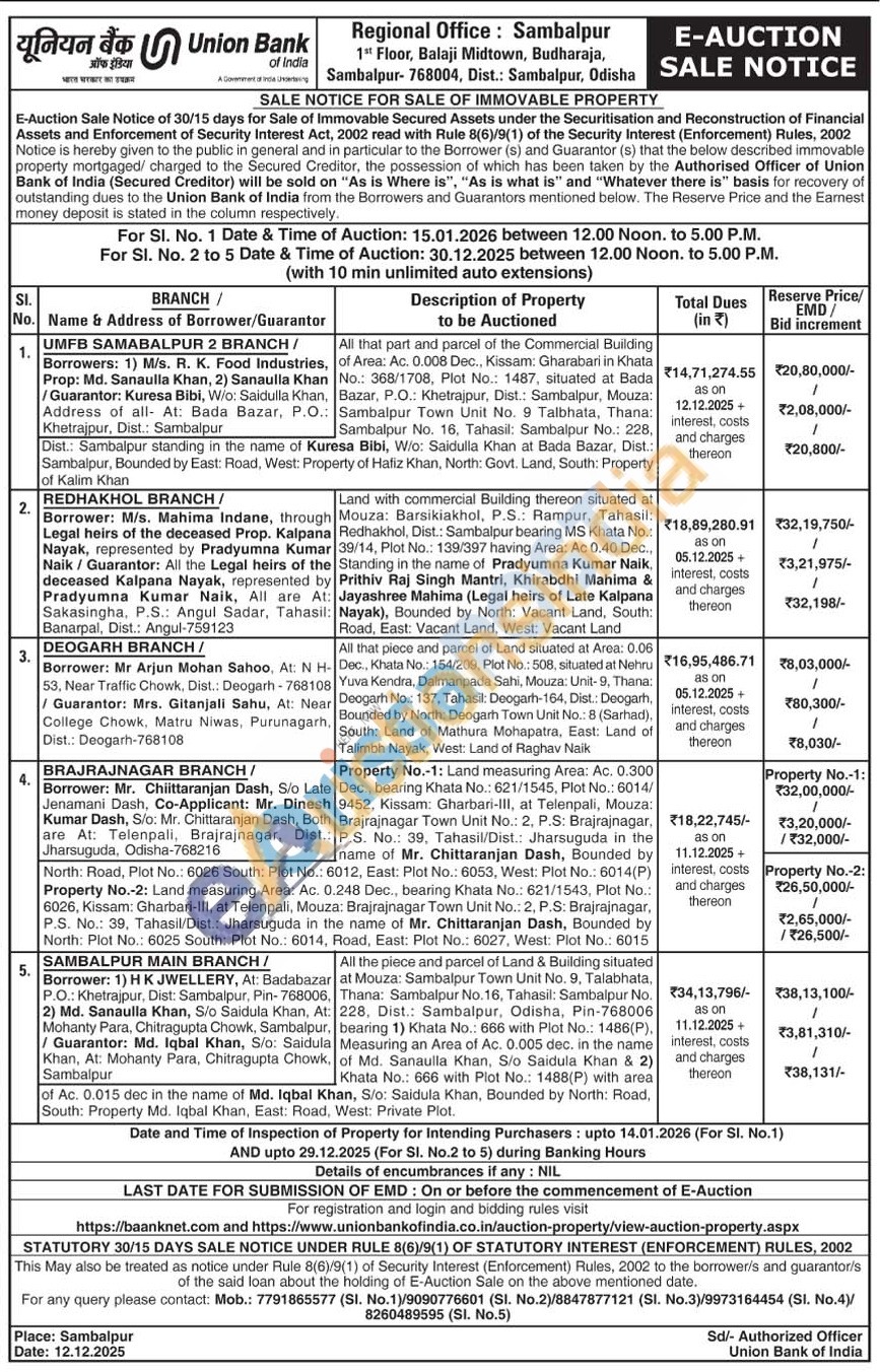 All that part and parcel of the Commercial Building of Area: Ac. 0.008 Dec., Kissam: Gharabari in Khata No.: 368/1708, Plot No.: 1487, situated at Bada Bazar, P.O.: Khetrajpur, Dist.: Sambalpur, Mouza: Sambalpur Town Unit No. 9 Talbhata, Thana: Sambalpur No. 16, Tahasil: Sambalpur No.: 228 Dist. Sambalpur standing in the name of Kuresa Bibi, W/o: Saidulla Khan at Bada Bazar, Dist Sambalpur, Bounded by East: Road, West Property of Hafiz Khan, North: Govt. Land, South: Property of Kalim Khan