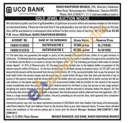 UCO Bank Gold Auctions Auction in Chennai