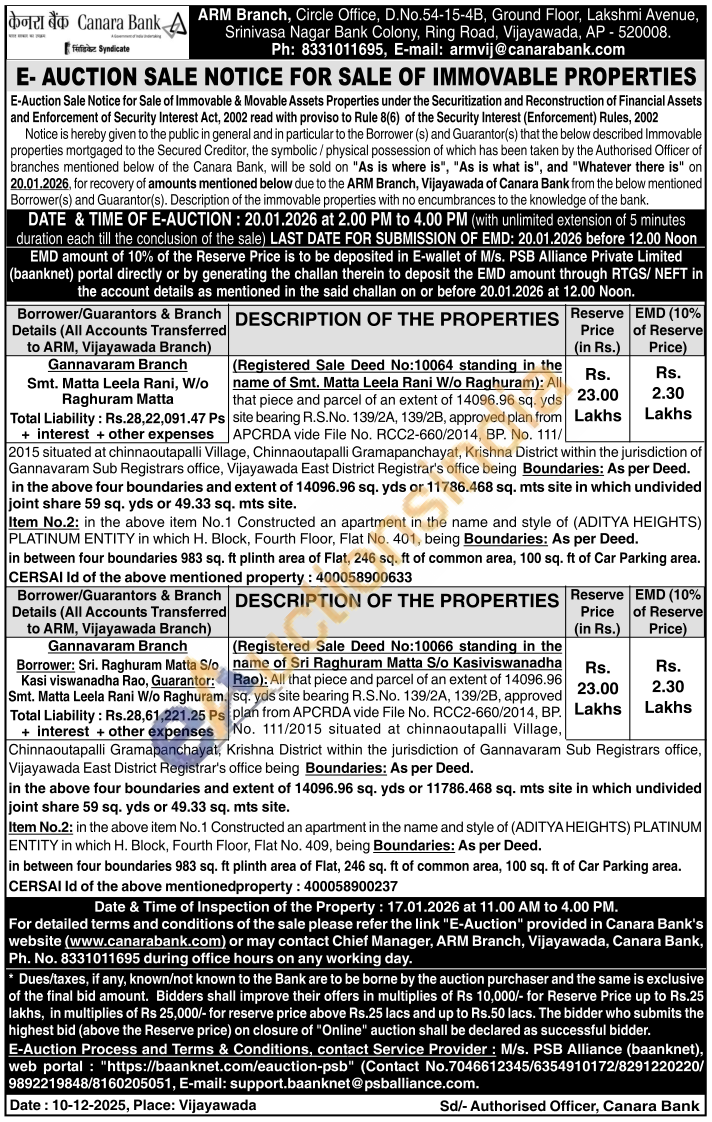 Registered Sale Deed No:10066 standing in the name of Sri Raghuram Matta S/o Kasiviswanadha Rao): All that piece and parcel of an extent of 14096.96 sq. yds site bearing R.S.No. 139/2A, 139/2B, approved plan from APCRDA vide File No. RCC2-660/2014, BP. No. 111/2015 situated at chinnaoutapalli Village Chinnaoutapalli Gramapanchayat, Krishna District within the jurisdiction of Gannavaram Sub Registrars office, Vijayawada East District Registrar's office being Boundaries: As per Deed. in the above four boundaries and extent of 14096.96 sq. yds or 11786.468 sq. mts site in which undivided joint share 59 sq. yds or 49.33 sq. mts site. Item No.2: in the above item No.1 Constructed an apartment in the name and style of (ADITYA HEIGHTS) PLATINUM ENTITY in which H. Block, Fourth Floor, Flat No. 409, being Boundaries: As per Deed. in between four boundaries 983 sq. ft plinth area of Flat, 246 sq. ft of common area, 100 sq. ft of Car Parking area. CERSAI Id of the above mentionedproperty: 400058900237