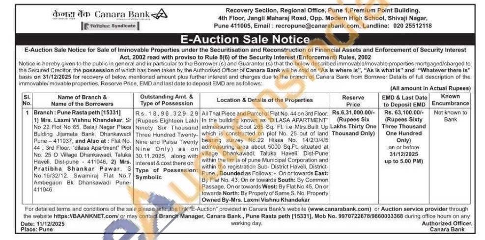 All That Piece and Parcel of Flat No. 44 on 3rd Floor. In the building known as "DILASA APARTMENT admeasuring about 265 Sq. Ft. ie Mtrs.Built Up which is constructed on plot No. 25 out of land bearing survey No.22 Hissa No. 14/2/3/4/5 on admeasuring area about 5000 Sq.Ft. situated at village Dhankawadi, Taluka Haveli, Dist-Pune within the limits of pune Municipal Corporation and within the registration Sub-District Haveli, District-Pune, Bounded as Follows: On or towards East: By Flat No. 43. On or towards South: By Common Passage, On or towards West: By Flat No.45. On or towards North: By Propety of Same S. No. Property Owned By-Mrs. Laxmi Vishnu Khandekar