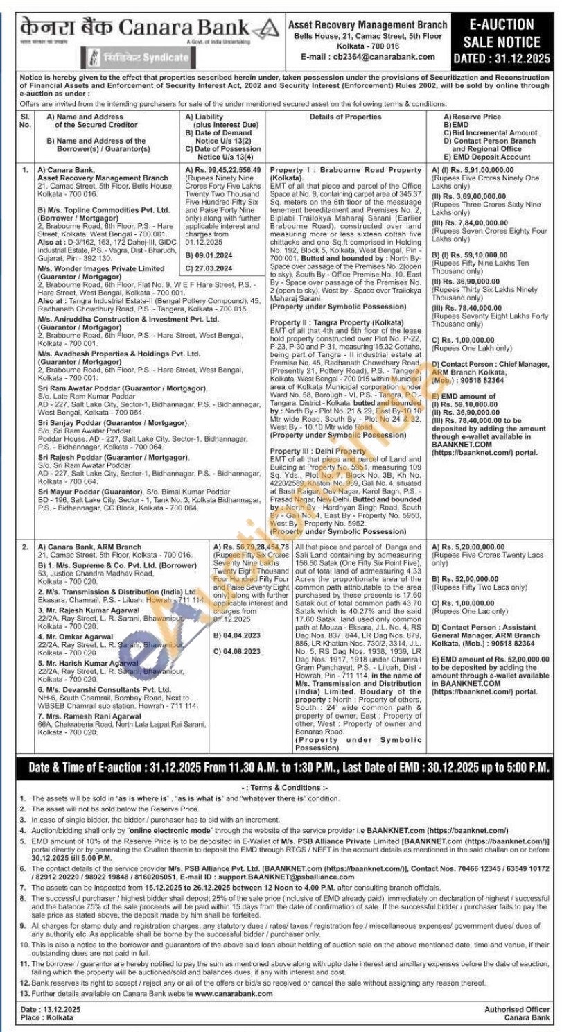 Property II: Tangra Property (Kolkata) EMT of all that 4th and 5th floor of the lease hold property constructed over Plot No. P-22. P-23, P-30 and P-31, measuring 15.32 Cottahs, being part of Tangra II industrial estate at Premise No. 45. Radhanath Chowdhary Road, (Presently 21, Pottery Road), P.S. Tangera, Kolkata, West Bengal-700 015 within Municipal area of Kolkata Municipal corporation under Ward No. 58, Borough-VI. P.S.-Tangra, P.O. Tangara, District-Kolkata, butted and bounded by: North By-Plot No. 21 & 29, East By-10.10 Mtr wide Road, South By Plot No 24 & 32. West By-10.10 Mtr wide Road. (Property under Symbolic Possession)