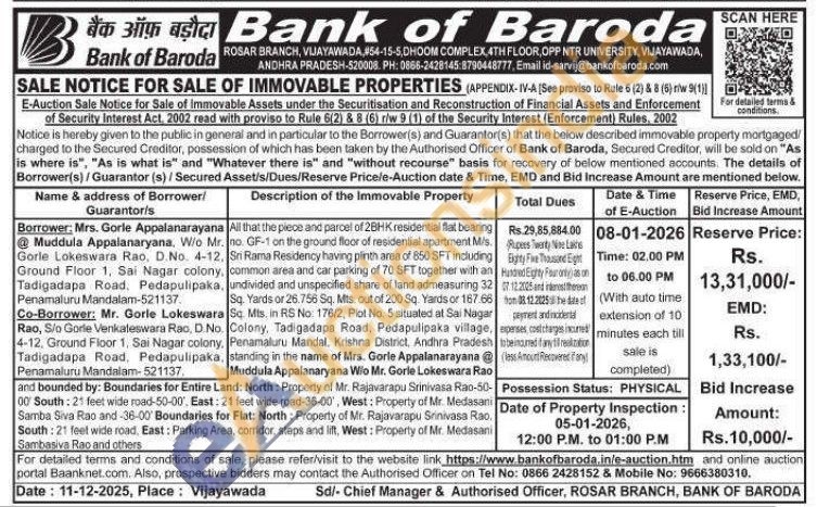 All that the piece and parcel of 2BHK residential flat bearing no. GF-1 on the ground floor of residential apartment M/s Sn Rama Residency having plinth area of 850 SFT including common area and car parking of 70 SFT together with an undivided and unspecified share of land admeasuring 32 Sq. Yards or 26.756 Sq. Mts out of 200 Sq. Yards or 167.66 Sq. Mts. in RS No: 176/2, Plot No. 5 situated at Sai Nagar Colony, Tadigadapa Road. Pedapulipaka village, Penamaluru Mandal, Krishna District, Andhra Pradesh standing in the name of Mrs. Gorle Appalanarayana