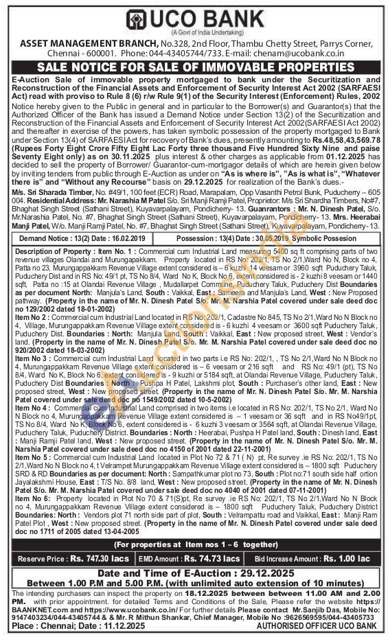 revenue villages Olandai and Murungapakkam. Property located in RS No: 202/1, TS No 2/1, Ward No N, Block no 4, Patta no 23, Murungappakkam Revenue Village extent considered is-6 kuzhi 14 veesamor 3960 sqft Puduchery Taluk Puduchery Dist and in RS No: 49/1 pt, TS No 8/4, Ward No K, Block No 6, extent considered is-2 kuzhi 8 veesam or 1440. sqft, Patta no:15 at Olandai Revenue Village, Mudallarpet Commune, Puduchery Taluk, Puduchery Dist Boundaries as per document North: Manjula's Land, South: Vaikkal, East: Sameera and Manjula's Land, West: New Proposed pathway. (Property in the name of Mr. N. Dinesh Patel S/o. Mr. M. Narshia Patel covered under sale deed doc no 129/2002 dated 18-01-2002)
