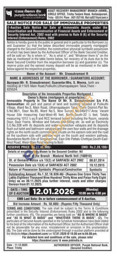 :All part and parcel of land and building situated at Pulikuthi Village, Ward No.5. Main Road, Uthamapalayam Taluk, Theni District. Plot No: S.No.96/1, Door No.85, Ward No.5. New Survey No.549/217.Area: Vacant House Site measuring East-West-45 feet, North-South-22 feet, Totally measuring 1012% sq.ft and RCC terraced house including the Room, varanda Door, Door Frame, Window and fixtures and fitting etc. as well as Electricity S.C.No.208 with its deposits and water connection vahayara and its deposits flush out toilet and bathroom vahayara and the own four walls and the drainage rights on the north south common land situate on the eastern side and the road on the southern side with pathway right on the south and western pathway Boundaries:North-Site of Singarammal, East-Site Pattalu Chettiyar, South-East-West Road, West-Main Road leading to Bodi.
