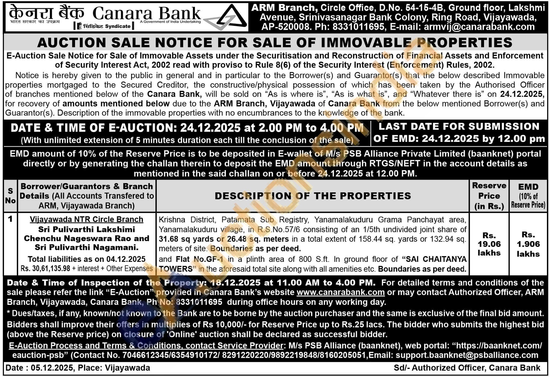 Krishna District, Patamata Sub Registry, Yanamalakuduru Grama Panchayat area, Yanamalakuduru village, in R.S.No.57/6 consisting of an 1/5th undivided joint share of 31.68 sq yards or 26.48 sq. meters in a total extent of 158.44 sq. yards or 132.94 sq. meters of site. Boundaries as per deed.and Flat No.GF-1 in a plinth area of 800 S.ft. In ground floor of "SAI CHAITANYA TOWERS" in the aforesaid total site along with all amenities etc. Boundaries as per deed.