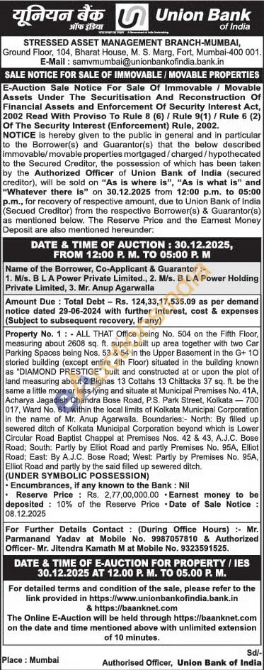 ALL THAT Office being No. 504 on the Fifth Floor, measuring about 2608 sq. ft. super built up area together with two Car Parking Spaces being Nos. 53 & 54 in the Upper Basement in the G+ 10 storied building (except entire 4th Floor) situated in the building known as "DIAMOND PRESTIGE built and constructed at or upon the plot of land measuring about 2 Bighas 13 Cottahs 13 Chittacks 37 sq. ft. be the same a little more or less lying and situate at Municipal Premises No. 41A, Acharya Jagadish Chandra Bose Road, P.S. Park Street, Kolkata-700 017, Ward No. 61, within the local limits of Kolkata Municipal Corporation in the name of Mr. Anup Agarwalla. Boundaries: North: By filled up sewered ditch of Kolkata Municipal Corporation beyond which is Lower Circular Road Baptist Chappel at Premises Nos. 42 & 43, A.J.C. Bose Road; South: Partly by Elliot Road and partly Premises No. 95A, Elliot Road; East: By A.J.C. Bose Road; West: Partly by Premises No. 95A, Elliot Road and partly by the said filled up sewered ditch