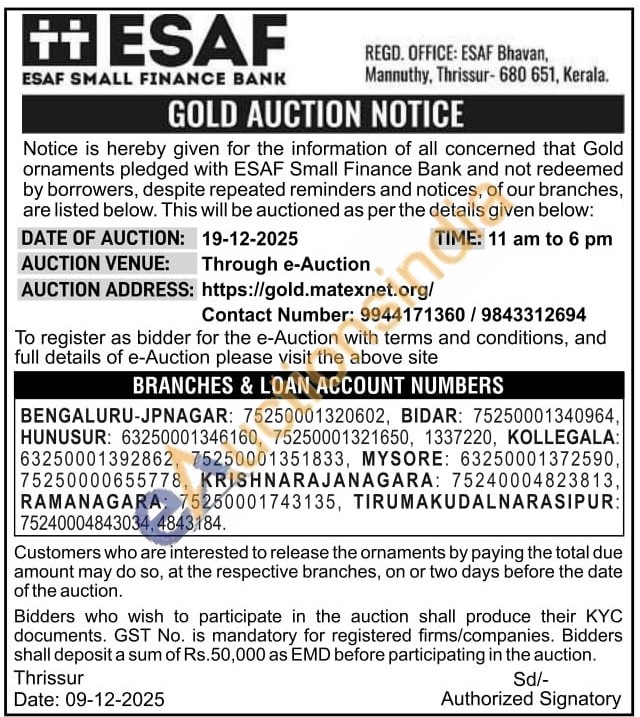 ESAF SMALL FINANCE BANK Gold Auctions Auction in Thrissur