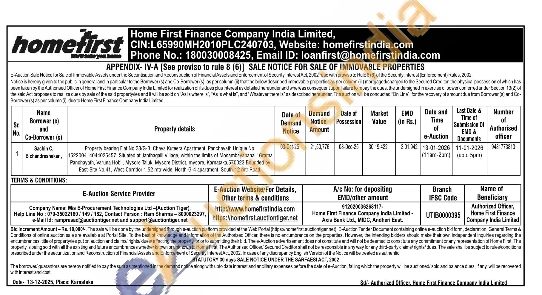 Property bearing Flat No.23/G-3, Chaya Kuteera Apartment, Panchayath Unique No. 152200414044025457, Situated at Janthagalli Village, within the limits of Mosambayanahalli Grama Panchayath, Varuna Hobli, Mysore Taluk, Mysore District, mysore, Karnataka, 570023 Bounded by East-Site No.41, West-Corridor 1.52 mtr wide, North-G-4 apartment, South-12 mtr Road