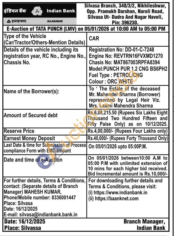 Registration No: DD-01-C-7248 Engine No: REVTRN16FVXMD1270 Chasis No: MAT867003RPFA8394 Model: PUNCH PUR 1.2 CNG BS6PH2 Fuel Type: PETROL/CNG Colour: ORC WHITE