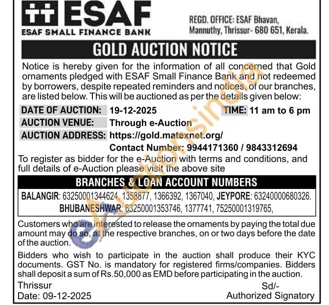 ESAF SMALL FINANCE BANK Gold Auctions Auction in Thrissur