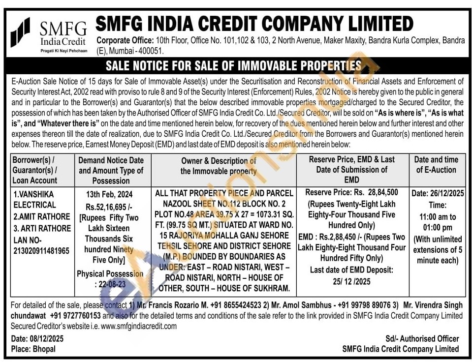 ALL THAT PROPERTY PIECE AND PARCEL NAZOOL SHEET NO.112 BLOCK NO. 2 PLOT NO.48 AREA 39.75 X 27 = 1073.31 SQ. FT. (99.75 SQ MT.) SITUATED AT WARD NO. 15 RAJORIYA MOHALLA GANJ SEHORE TEHSIL SEHORE AND DISTRICT SEHORE (M.P.) BOUNDED BY BOUNDARIES AS UNDER: EAST - ROAD NISTARI, WEST -ROAD NISTARI, NORTH - HOUSE OF OTHER, SOUTH - HOUSE OF SUKHRAM.